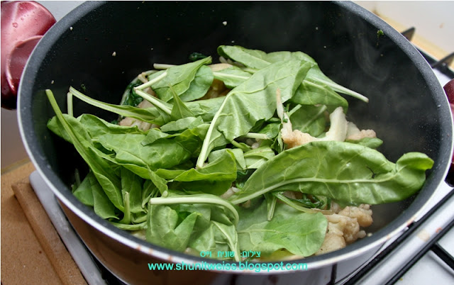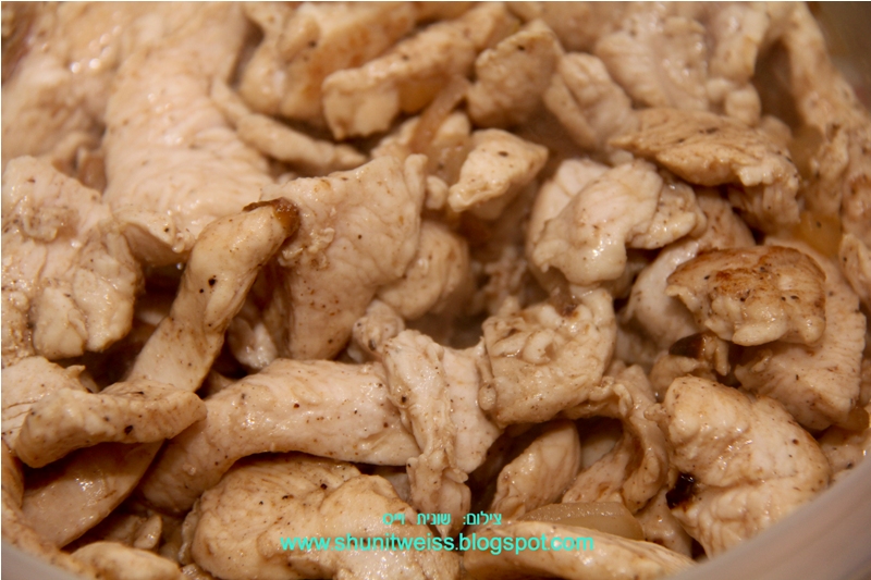 מוסיפים את רצועות חזה העוף, ותבלינים(מלח+פלפל)