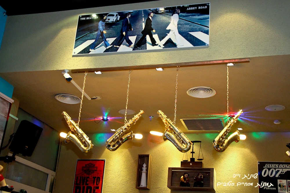 הבת שלי כמובן בחרה לשבת ליד תיבת הנגינה המעניינת(והמקורית!), כשמעל הראש שלנו תלויים סקסופונים שהוסבו למנורות.
