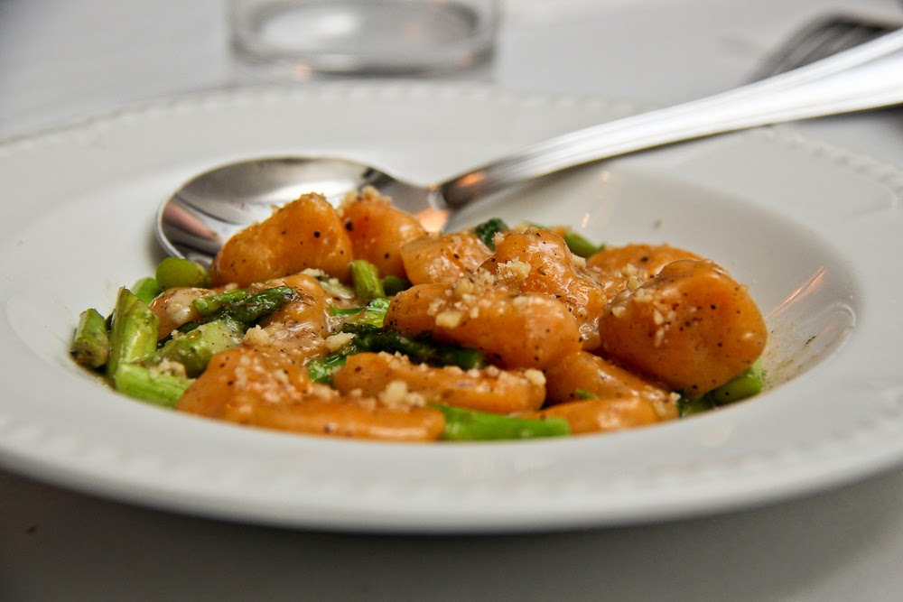 הניוקי היו רכים ונימוחים, האגוזים נתנו את הקראסט, והאספרגוס את הצבע והטעם.